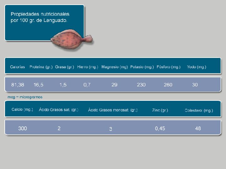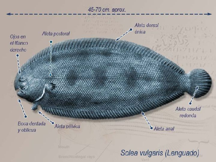 El lenguado común o Solea vulgaris pertenece a la familia de los Soleidos, dentro del orden Pleuronectiformes. En los últimos años se ha convertido, junto con el rodaballo, en uno de los pescados planos más demandados en el mercado. Su cuerpo presenta forma ovalada y plana, salvaguardado por escamas muy pequeñas, con boca dentada y oblicua de labios protráctiles (que se estiran para atrapar a su presa). En su etapa de juventud tiene un ojo a cada lado de la cabeza, pero conforme va alcanzando la madurez el ojo izquierdo se desplaza hasta alcanzar el flanco derecho de la cabeza, viviendo el resto de sus días con el lado ciego pegado al fondo marino. Su tamaño alcanza los 45-70 cm, pesando entre 1 y 3 kilos. Posee dos colores claramente diferenciados: en el costado superior tonalidades verdes amarronadas, que pueden llegar a mimetizarse con la arena o piedras del fondo; mientras que el costado inferior, siempre pegado al suelo, es blanco. Como curiosidad añadir que al sentirse en peligro, con un ligero movimiento de aletas, se entierra bajo la arena del lecho marino. En el Mar Menor existen ejemplares adaptados a las particulares condiciones del agua de la laguna (elevada salinidad), que no suelen superar los 20 cm de longitud (la talla mínima para su captura), con sabor y textura diferenciada. Hábitat y alimentación El lenguado habita en los fondos arenosos (entre 50 y 200 metros de profundidad) del Atlántico nororiental, Mar del Norte, Mar Báltico y Mar Mediterráneo. De hábitos nocturnos, pasa la mayor parte del tiempo semienterrado en la arena, dejando al descubierto apenas sus ojos, siempre al acecho para capturar presas como pequeños peces, crustáceos e invertebrados que habitan el fondo del mar. Propiedades nutritivas y salud El lenguado, al ser un pescado blanco, contiene un porcentaje de grasa muy bajo, aproximadamente 1,5 gramos cada 100. Destaca especialmente por sus altos niveles en proteínas de valor biológico y vitaminas del grupo B. También contiene minerales, principalmente fósforo, potasio, magnesio y yodo. Los tres primeros aparecen en cantidades similares a otras especies, sin embargo el contenido en yodo es importante. Este último regula el funcionamiento de la glándula tiroides, fortalece la estructura dental, ósea y el sistema nervioso, y equilibra la cantidad de agua dentro y fuera de la célula.